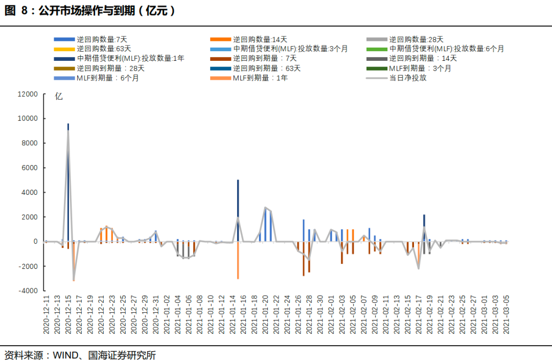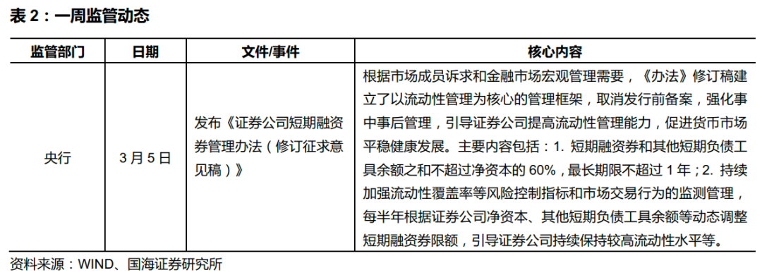本周央行继续回笼流动性。本周央行共投放 500 亿元 7 天逆回购。其中周一到周五(3 月 1 日至 5 日)各投放 100 亿元 7 天逆回购。本周共有 800 亿元央行逆回购到期,全口径公开市场操作实现净回笼 300 亿元。之后一周(3 月 8 日至14 日),将有 500 亿逆回购到期。