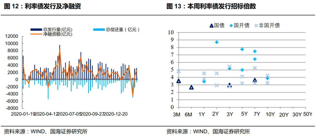 本周利率债净融资额较上周增加。本周一级市场共发行 30 支利率债,实际发行总额为 3,259.49 亿元,较上周增加 128.99 亿元;总偿还量为 745.33 亿元,较上周减少 1,372.07 亿元;净融资额为 2,514.16 亿元,净融资较上周增加 1,501.06亿元。