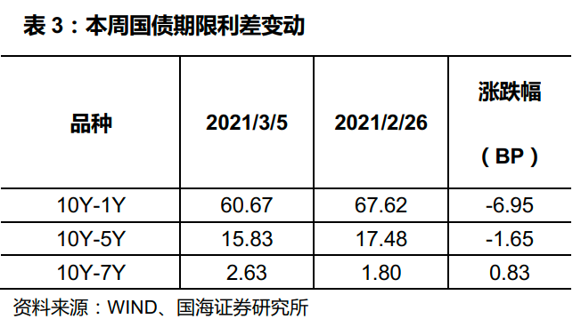 各期限利差涨跌不一。3月5日,与上周五相比,10Y-1Y利差下行6.95BP,10Y-5Y利差下行 1.65BP,10Y-7Y 利差上行 0.83BP。