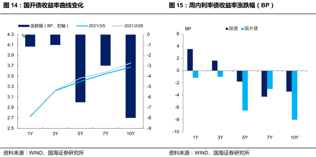 国债收益率短上长下。3 月 5 日,1 年期国债收益率为 2.6390%,较上周五上行3.54BP;3 年期国债收益率为 2.9194%,上行 1.66BP;5 年期国债收益率报3.0874%,下行 1.76BP;7 年期国债收益率报 3.2194 %,下行 4.24BP;10 年期国债收益率报 3.2457%,下行 3.41BP。