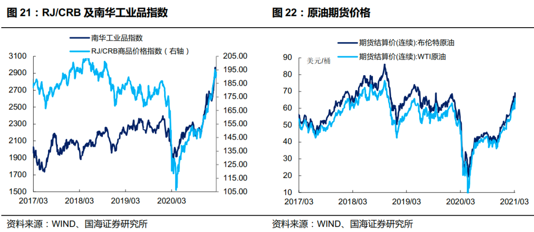 商品价格指数、石油期货价格涨跌不一。3 月 5 日,南华工业品价格报 2879.60点,较上周五下跌 1.21%;RJ/CRB 商品价格指数收于 193.45 点,较上周五上涨 1.66%;2 月 25 日,布伦特原油期货和 WTI 期货结算价分别报 69.36 美元和66.09 美元,较上周五分别上涨 4.88%和 7.46%。