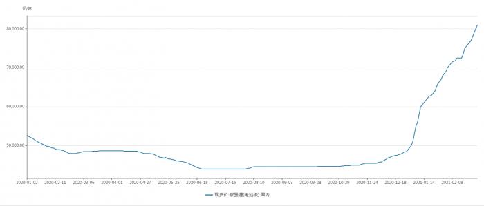 Wind数据显示,2月1日国内电池级碳酸锂价格为68000元/吨,至3月8日这一价格已升至81000元/吨。