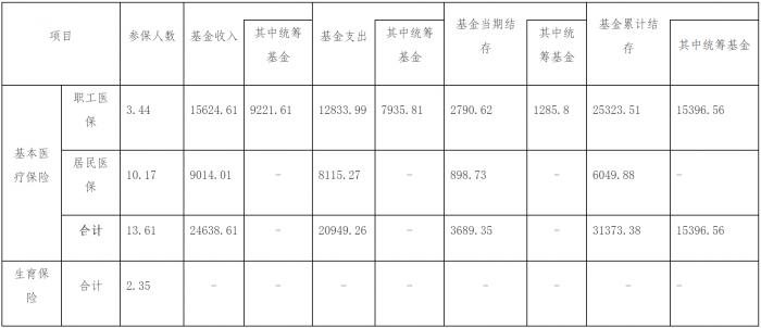 全年基本医疗保险基金(含生育保险,下同)总收入、总支出分别为24638.61亿元、20949.26亿元,年末基本医疗保险累计结存31373.38亿元。