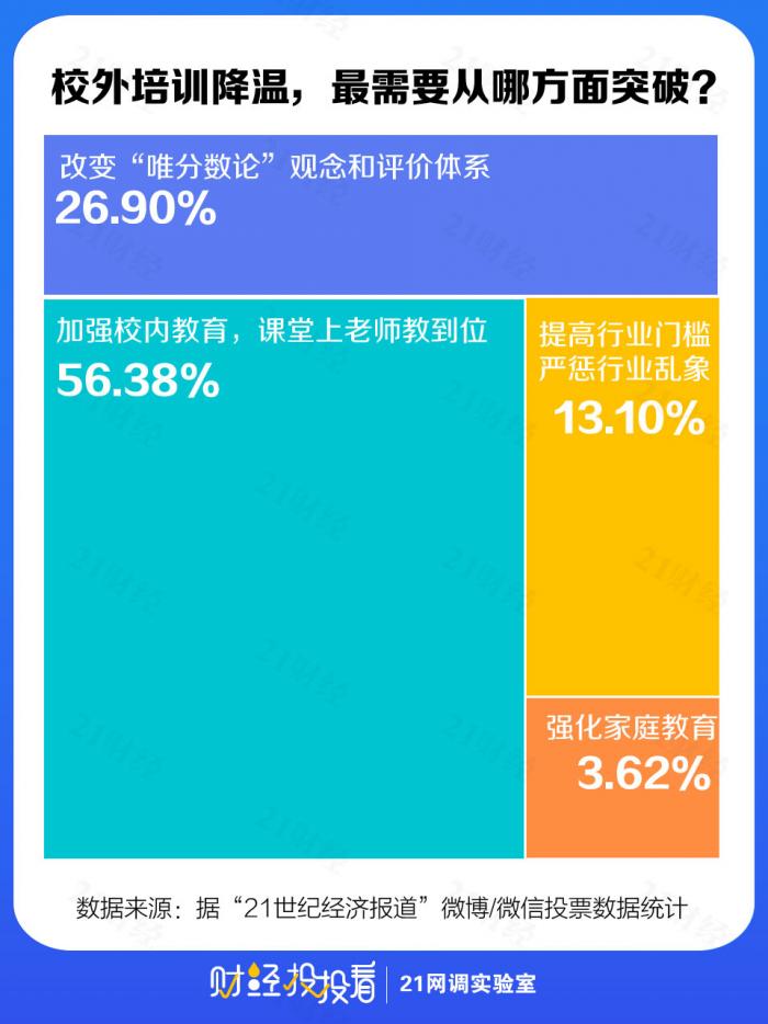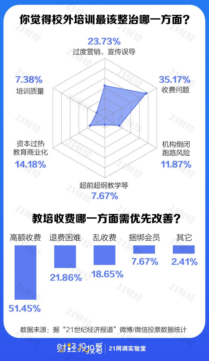 对于新一年的校外培训整治,网友们抱有什么样的态度和期待?21网调实验室对此进行了一系列投票调查。调查发现,减负呼声下,校外培训的需求仍十分强劲,高额收费最受诟病,据一位网友反映,今年上海某培训机构初二到初三补习班报价甚至高达36万。超5成网友希望加强校内教育,课堂老师能教到位,以给校外培训降温。
