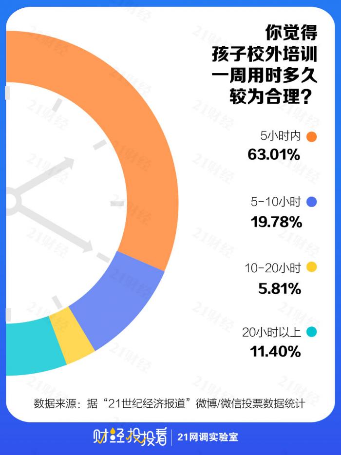 如果校外培训不可避免,也需注意不能给孩子过重的负担。在21网调实验室关于补习时长的问题上,超6成网友觉得孩子进行校外培训的时长控制在一周5小时以内比较合理。
