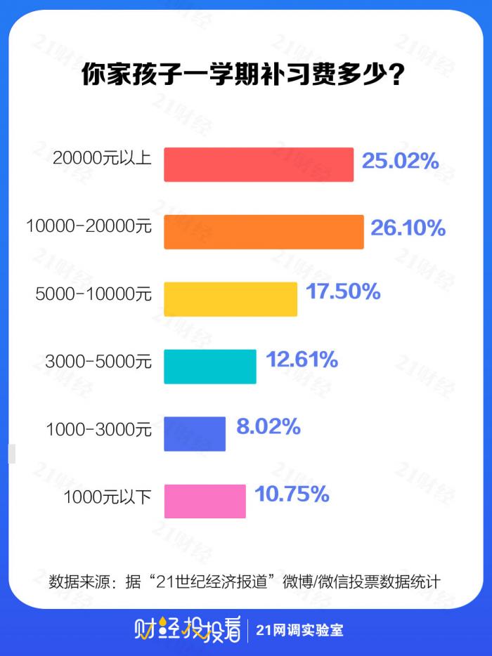 费用方面,一学期补习费用上万元的现象非常普遍,选择1万元以上的家长占比过半。有坐标上海的网友反映,一位家长给孩子报班一年花了20万,今年培训机构刚报价初二到初三36万。这样动辄上万、甚至几十万的水平,对许多家长而言,负担颇大。