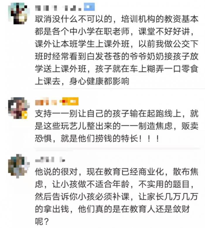 支持取缔的网友则认为,孩子负担确实太大,对身心都造成损害;培训机构制造焦虑贩卖恐惧,教育商业化之风需要遏止……