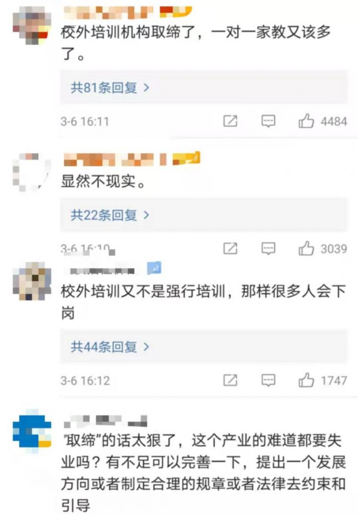 在评论区,“反对派“网友最为活跃,他们认为这一做法不现实,原因包括,“校外培训机构取缔了,一对一家教又该多起来”、“如果校外培训机构是合法经营,凭什么取缔?“、校外培训是自愿的非强迫的、彻底取缔会导致很多人下岗、父母上班没时间不如让孩子去培训机构多学点,等等。