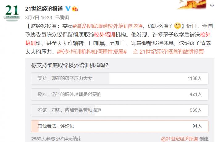 对此,网友们的意见较为激烈。根据21网调实验室发起的投票,支持取缔的网友最多,占比超过4成;其次是在支持与反对之间的“监管派”网友,他们认为“不应一刀切,应加强监管和规范”,占比约为36%;反对取缔也有约16%。总体来看,不支持彻底取缔的网友(包括“监管派”)还是更多,校外培训的需求仍然庞大。