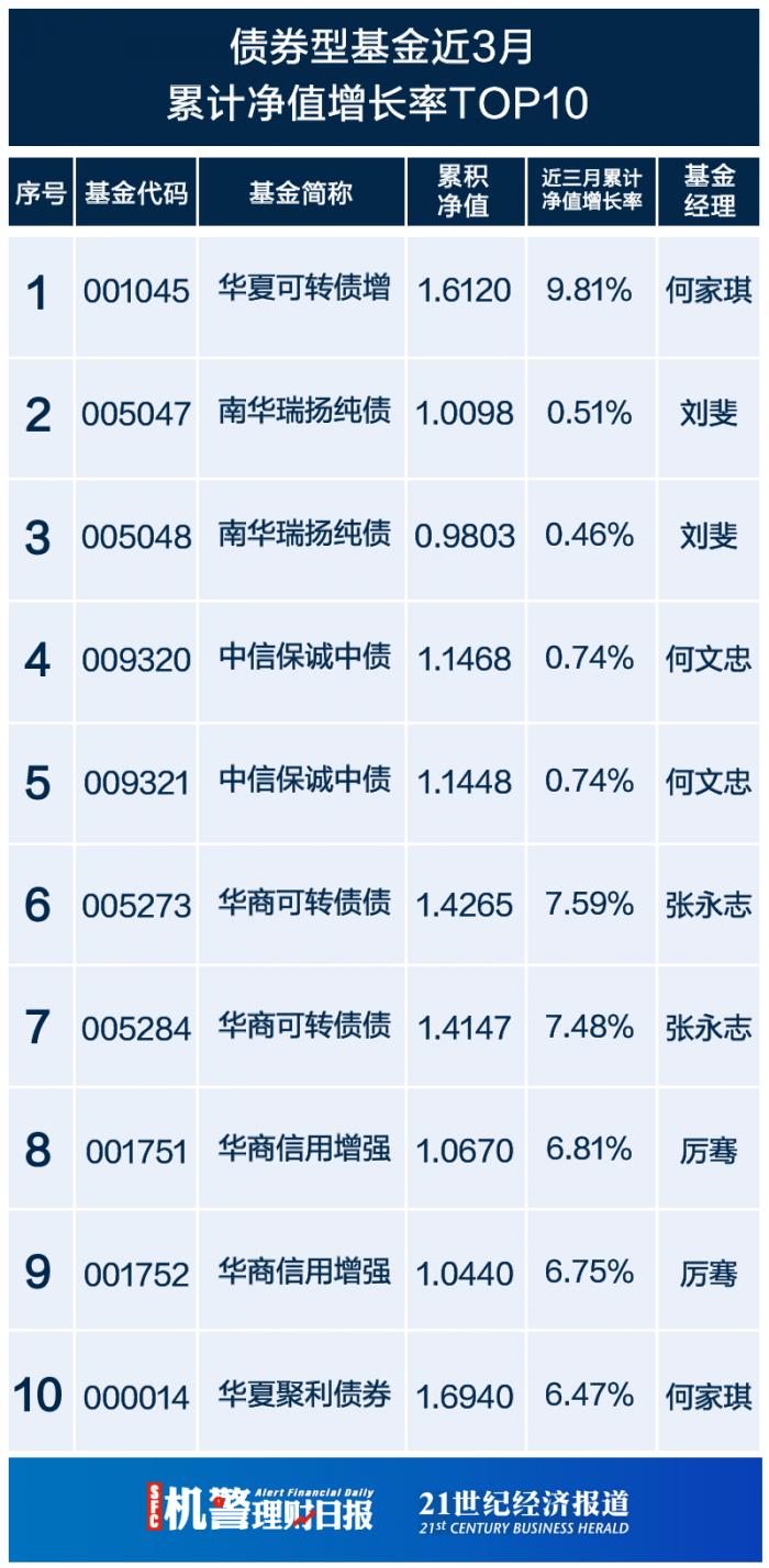 今日债券型基金榜单中,从近3月累计净值增长率来看,增长率最高的前10位产品包括华夏可转债增强债券A、南华瑞扬纯债A、南华瑞扬纯债C等。其中,华夏聚利债券于前10位中累计净值最高,为1.6940;持仓方面,其股票仓位百分比达27.64%,持仓占比前三为先导智能、东方财富、玲珑轮胎;评级方面,济安金信评级5星,上海证券评级2星。