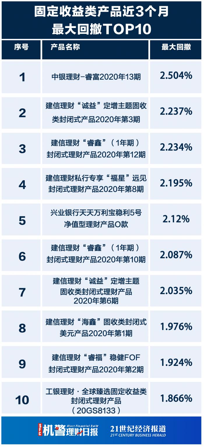 根据南财理财通数据,近3个月固定收益类产品最大回撤排行榜中,回撤最大的前10位产品包括中银理财的睿富系列、建信理财“诚益”系列、“睿鑫”系列、“海鑫”系列、“睿福”稳健FOF系列、私行专享“福星”远见系列、兴业银行天天万利宝系列、工银理财全球臻选系列。其中建信理财占据7个席位,中银理财、兴业银行、工银理财各占据1个席位。回撤最大的为中银理财-睿福2020年13期。