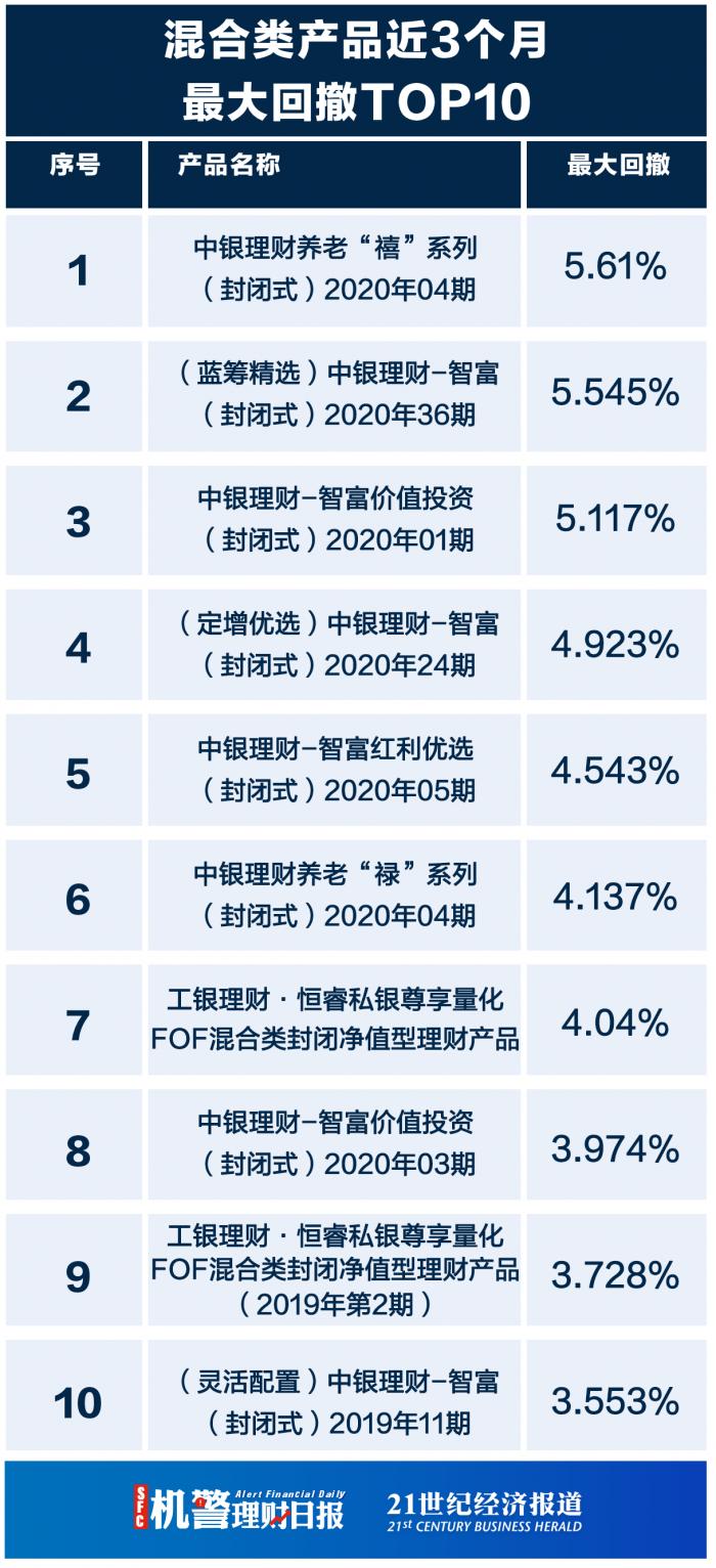 根据南财理财通数据,近3个月混合类产品最大回撤排行榜中,回撤最大的前10位产品包括中银理财养老“禧”系列、智富系列、智富价值投资系列、智富红利优选系列、养老“禄”系列、工银理财恒睿私银尊享量化FOF系列。其中中银理财占据8个席位、工银理财占据2个席位。回撤最大的为中银理财养老“禧”系列(封闭式)2020年04期。