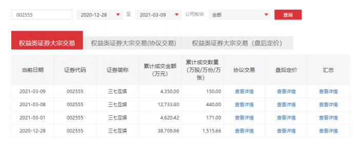 三七互娱在此期间的大宗交易共发生三次,时间分别是2020年12月28日、2021年3月1日和3月8日,交易数量分别为1515.66万股、171万股和440万股,成交金额分别是38709.96万元、4620.42万元和12733.60万元。