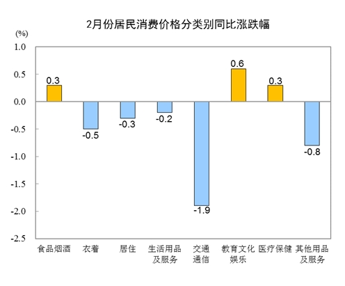 2月份居民消费价格同比下降0.2% 环比上涨0.6%
