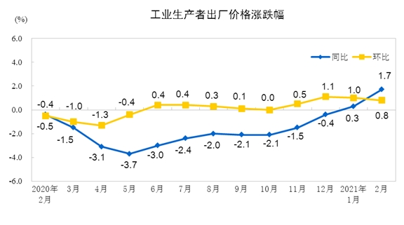 2月份工业生产者出厂价格同比上涨1.7% 环比上涨0.8%