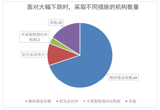 根据报告显示,机构投资者在面对市场风险释放、大幅下跌时主要采取的措施是赎回基金份额。在所有63家机构中,44家机构选择赎回基金份额,7家选择使用衍生品对冲,2家机构选择不采取特别应对机制,10家机构选择其他,其中7家表明会依据后市判断、分析导致市场波动的原因,灵活应对,2家机构暂未投资公募基金(均为期货公司),1家机构目前策略以固定收益类基金为主,不涉及上述问题。