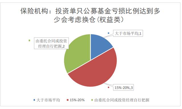 再具体到权益类投资的调仓方面,记者注意到,6家保险机构中,3家机构选择亏损15%-20%会考虑换仓,2家机构表示会根据委托合同或投资经理自行把握,1家机构表示在亏损大于市场平均时会考虑换仓;以上三类占比分别为50%、33%、17%。