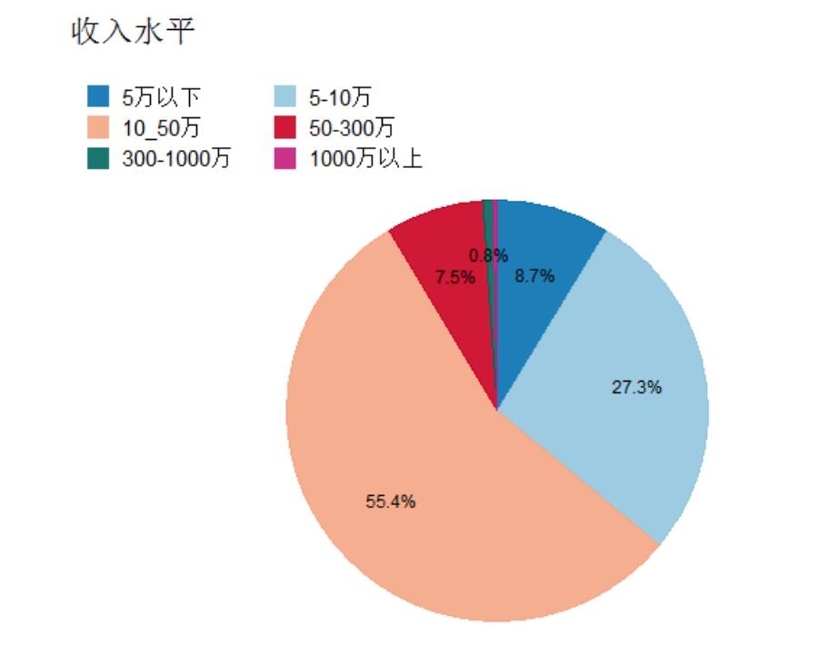 根据调查问卷数据显示,8.7%的个人投资者收入水平在5万元以下;27.3%的个人投资者收入水平在5-10万元之间;55.4%的个人投资者的税后年收入在10-50万之间;7.5%的个人投资者税后年收入在50-300万;300万以上的个人投资者占比0.8%。