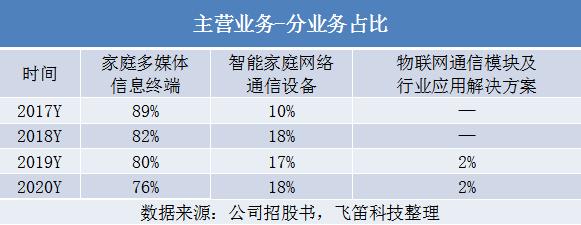 拆分公司收入结构,公司主营业务由家庭多媒体信息终端、智能家庭网络通信设备和物联网通信模块及行业应用解决方案等构成,其中家庭多媒体信息终端、智能家庭网络通信设备