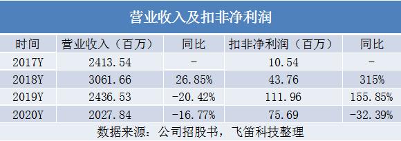 先来看公司整体的营收和净利润情况,据招股书最新数据,2020年,公司实现营收20.28亿元,同比下降16.77%,扣非净利润为7569万元,同比下降32.39%。2020年公司的业绩持续为负增长,报告期内扣非净利润增速持续下滑。
