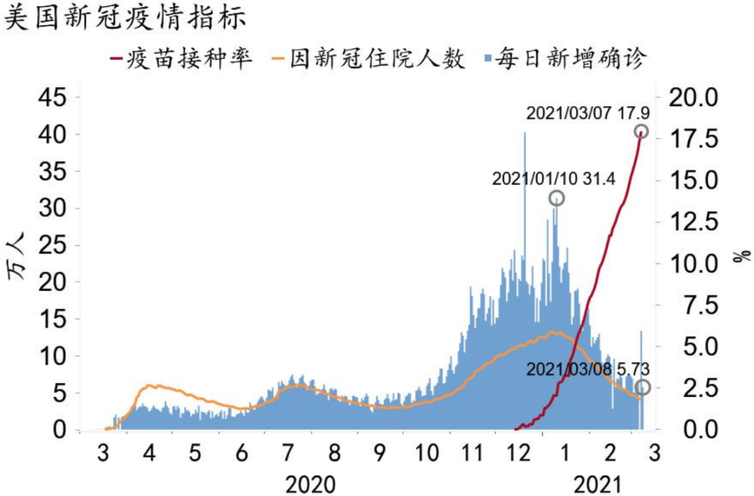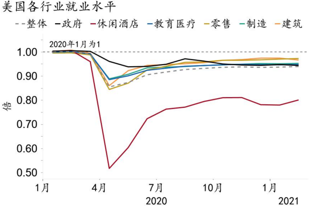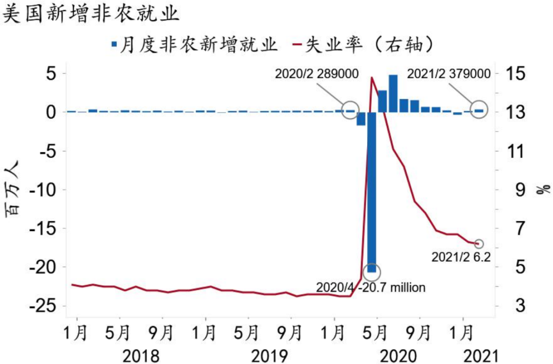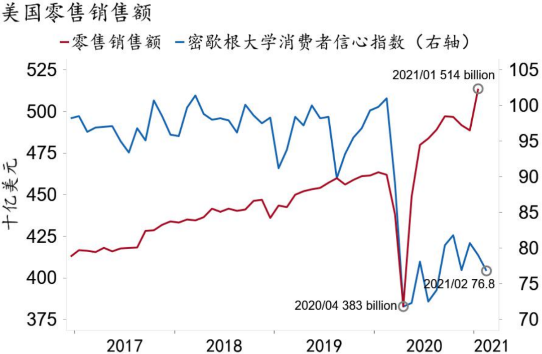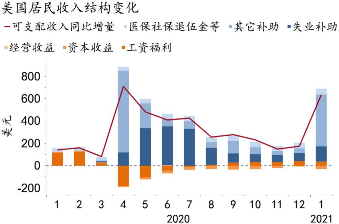 疫情爆发后,美国政府已推出了四轮共计约3.9万亿美元的财政刺激,对疫后经济迅速复苏起到了至关重要的作用。特别是第三轮“关怀法案”及其补充方案(共计约2.7万亿)减轻了疫情对企业和居民资产负债表的冲击,复工后零售消费和就业超预期修复,带动需求“外溢”。而去年12月底生效的第四轮财政补贴(约9,000亿)仅是美国选后权力过渡期的权宜方案,涵盖的领域较为有限,且大部分将在本月到期。