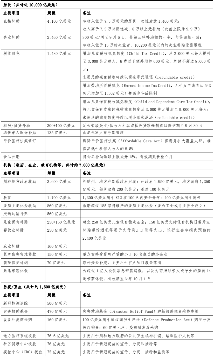 此次刺激方案主要涵盖居民、机构(政府/企业)和防疫等领域: