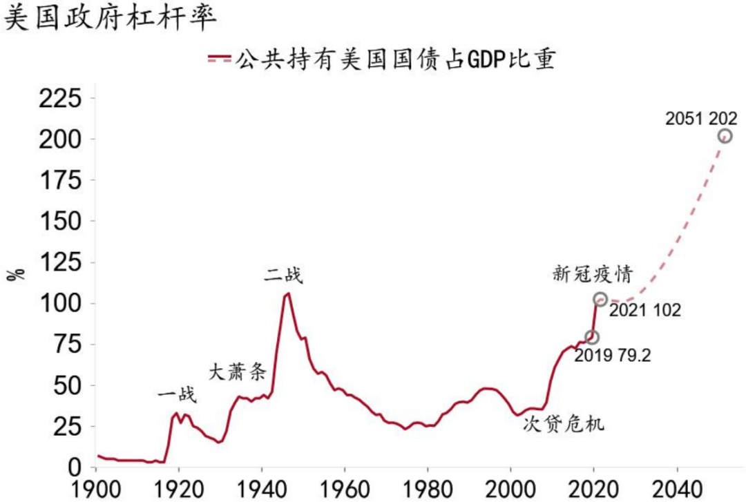 一是本轮刺激方案未获共和党支持。与此前广泛的跨党派支持不同,本轮刺激方案存在较大争议。民主党最终选择走“预算调解”(budget reconciliation)途径,在简单多数规则下通过了法案【注释1】。争议集中在两方面:一是必要性。随着疫苗接种和疫情缓解,市场担忧过度财政刺激将使经济过热从而大幅推高通胀和利率,打乱经济修复节奏。二是可行性。四轮补贴使美国政府杠杆率突破100%,达到战后最高水平。国会预算办公室(CBO)预测在2051年政府杠杆率将翻番,债务付息成本将占全年GDP的8.2%。但刺激方案获得美国民众的广泛支持,民调显示69%的美国选民(84%民主党,54%共和党)支持该法案。