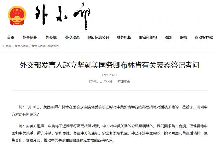 问:3月10日,美国务卿布林肯在国会众议院外委会听证时对中美即将举行的高层战略对话谈了他的一些看法。请问中方对此有何评论?