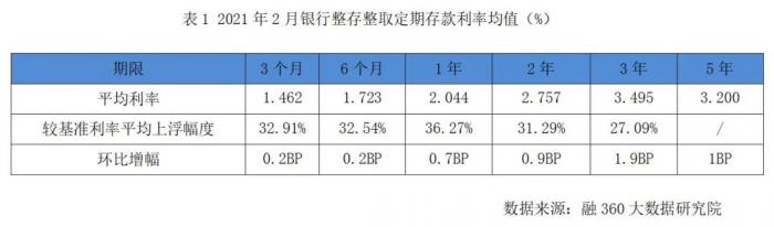 3月11日,融360大数据研究院发布监测报告显示,从2020年9月到2021年2月,银行定存平均利率除五年期连续上涨5个月外,其余各期限定存利率已连续上涨6个月。其中,3年期涨幅最大,较去年9月上涨16.5BP。2年期、1年期、6个月期、3个月期则分别上涨9.3BP、4.1BP、1.5BP和1.2BP。