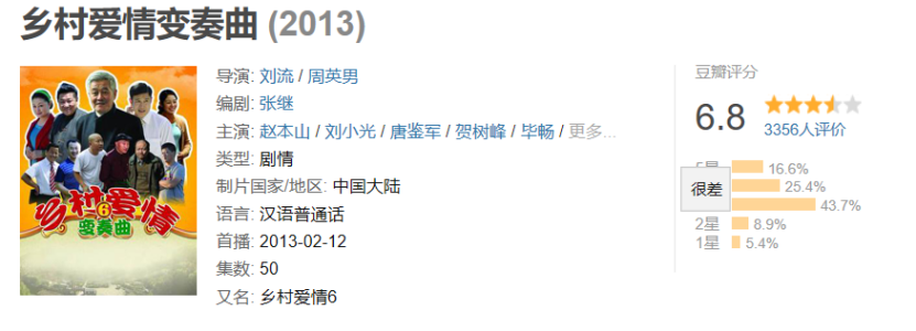 当时,小沈阳凭借春晚小品《不差钱》一炮而红,是赵本山旗下名气最大的徒弟。《乡爱6》中,赵、沈师徒齐上阵,显然也是为了安抚观众,顺利助《乡爱》系列“南下”。遗憾的是,这部来势汹汹的“南下”之作并未收获理想成绩。豆瓣上,《乡爱6》仅获得6.8分;收视上,“四星联播”,却无一家卫视进入年度收视前10,反响一般。