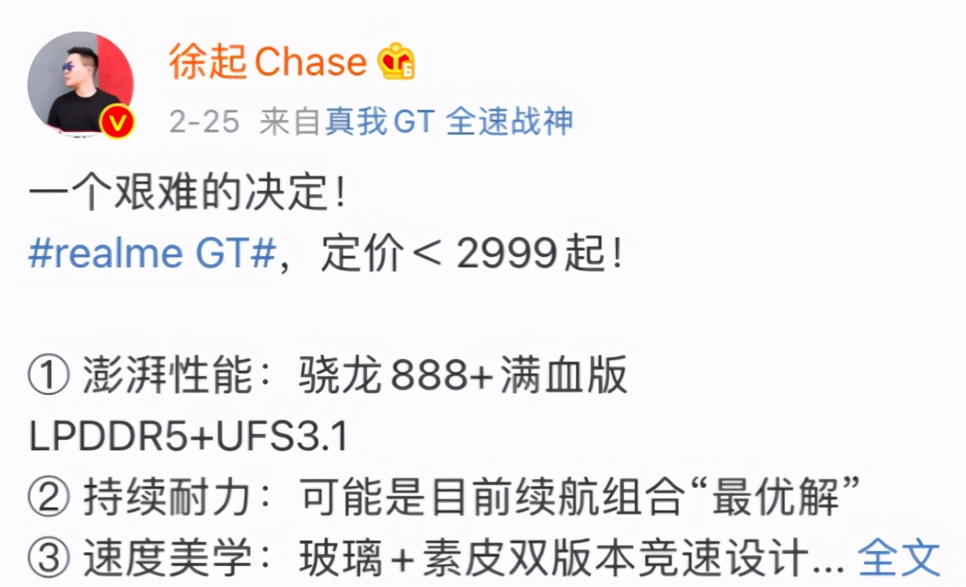 你方唱罢我登场,另一边同样搭载“高通骁龙888”芯片的旗舰机型Realme GT传来消息,真我Realme全球营销总裁徐起在微博发布消息,Realme GT的定价将以低于2999起的售价发布。