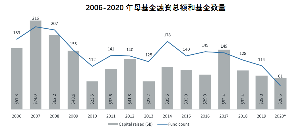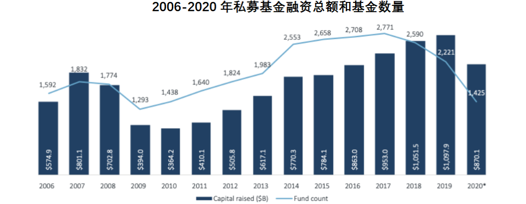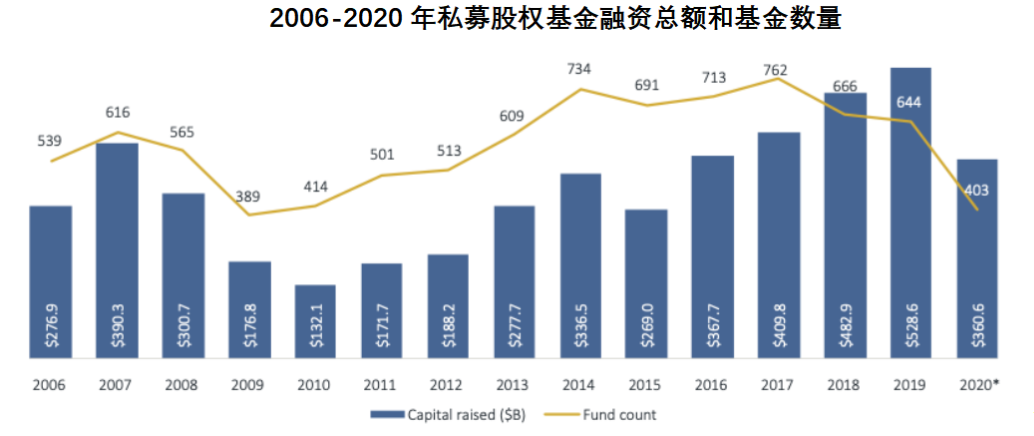 2020年,私募股权基金的募资额减少了三分之一,403支私募股权基金共募集了3,606亿美元, 是2015年以来最低水平,其中巨型基金(募资额大于50亿美金的私募股权基金)有所减少。