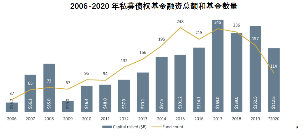 相比2019年,2020年私募债权市场也有比较明显的下滑。直接借贷在私募债权市场占较大份额,但投资者担心回款违约,因此直接借贷的增长速度也放缓了许多。私募股权交易是目前直接借贷的主要来源,由于低利率和私募股权基金的持续加持,2021年私募债权市场将会迎来长期的利好,并会看到明显的回升。