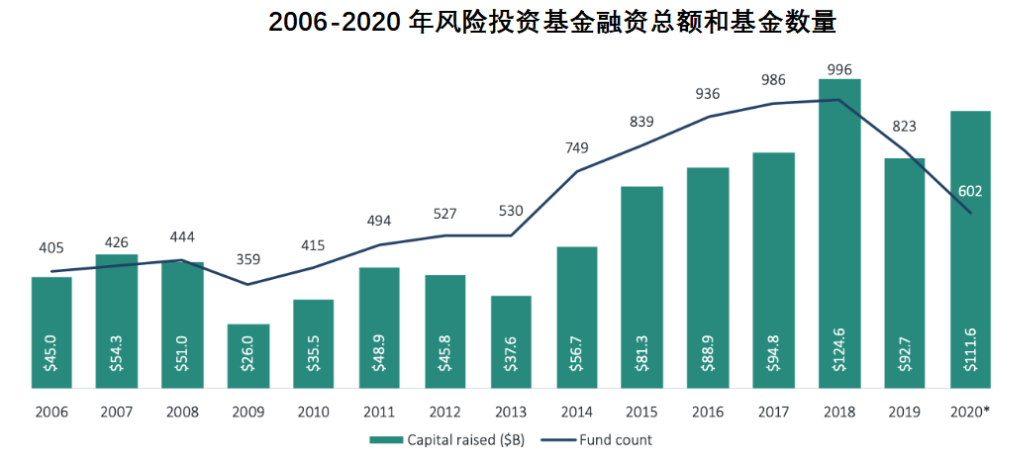 潜在的增长和高额回报率是风投基金在过去几年成功募资的重要因素,巨型基金占54.4%,数量同比增长69.5%至61个。基准利率接近零以及强势的IPO市场带来了巨大市场流动性,也让风投基金搭上了当前募资环境比较友好的顺风车。而小型风投基金(低于5000万美元规模)则在2020年急剧收缩,表明新兴风投基金和第一次设立的风投基金受疫情的影响较大。