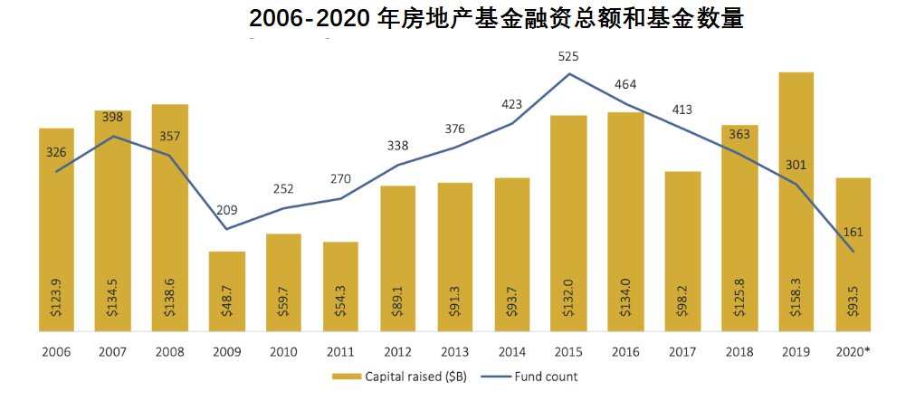 房地产基金的募资额相比2019年下滑了近40%,黑石集团下属的房地产基金Europe VI是唯一一支2020年募资超过50亿美元的地产基金。