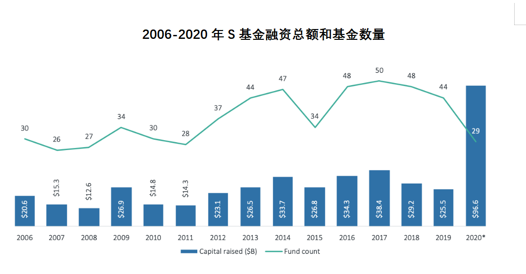 2020年S基金的募资额超过了过去三年的总和,甚至是2017年(2010年之后最大募资额年份)的2.5倍。高盛的Vintage Fund VIII是2020年四季度募资金额最大的S基金,为103亿美元。2020年S基金募资市场的疯狂,源于投资者相信疫情期间的危机,可以让他们以相对较低的价格进行投资。