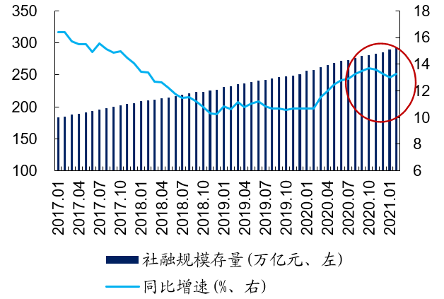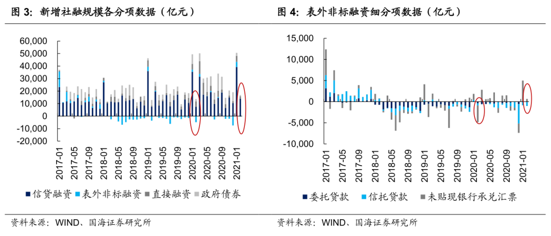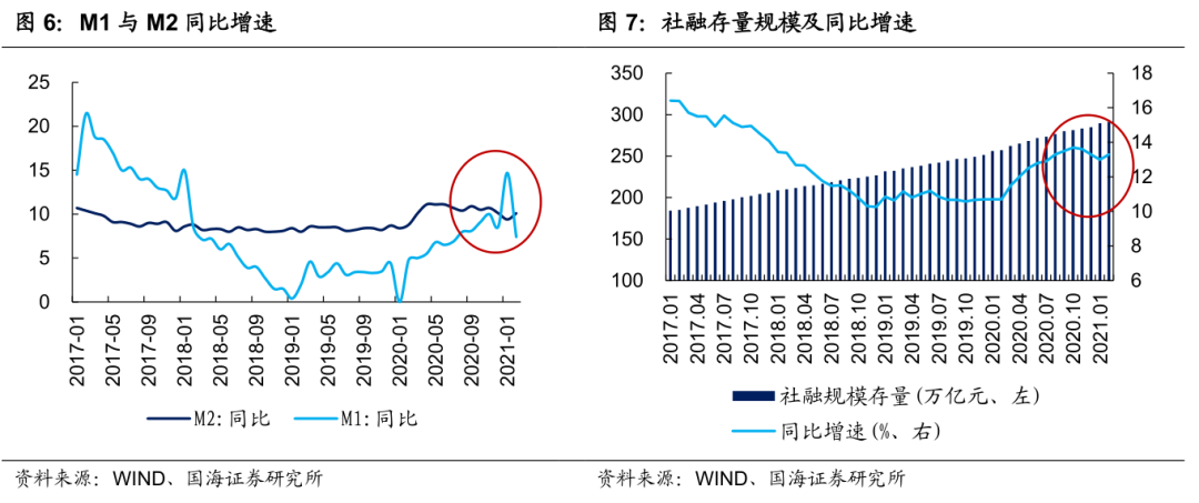 其中,同样是因为2月份大量奖金的发放,使得企业存款向居民存款转移,进而造成 M1增速的回落。但即使在过春节的2月份,受益于信贷投放的强劲拉动,M2增速和社融增速均保持了高增长。不过,考虑到后续基数的抬升,以及房地产调控政策的陆续出台,随着信用的边际收紧,社融增速仍将会受到拖累,保持趋势向下。