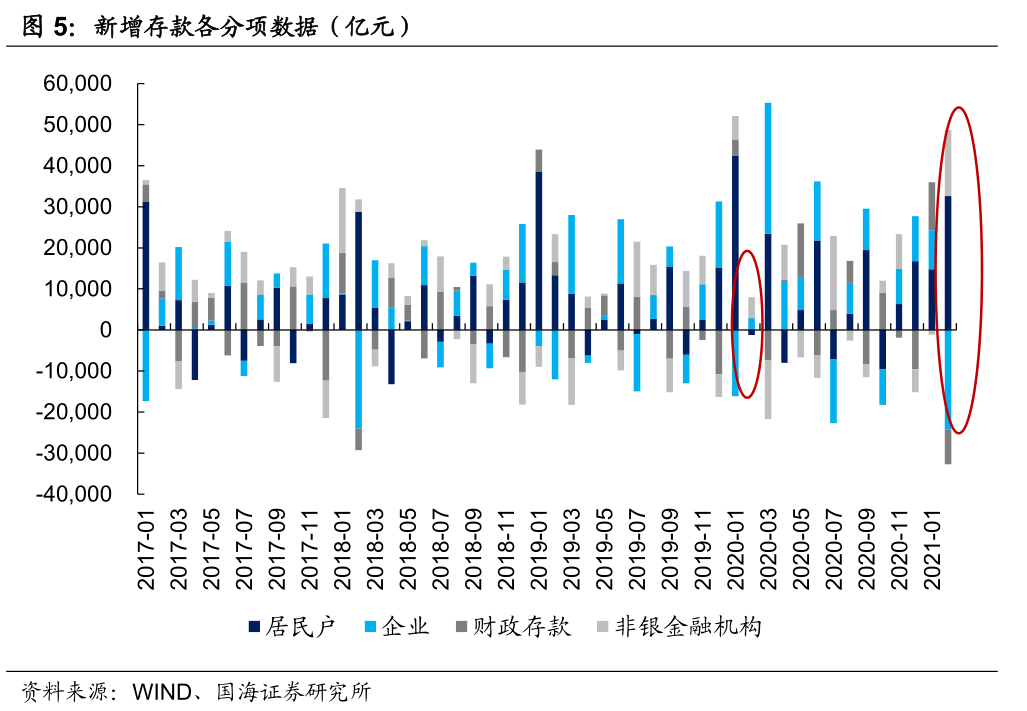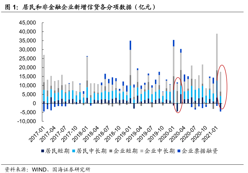 不可否认,这与去年2月份疫情发生后,居民隔离在家,线下消费和购房需求均受冲击,同比基数较低有关。但与此同时,也需要看到,在2月份包含春节因素的情况下,居民短期贷款和中长期贷款仍有较高的同比增长,这也侧面表明在“就地过年”下,居民消费和购房需求仍然非常旺盛。