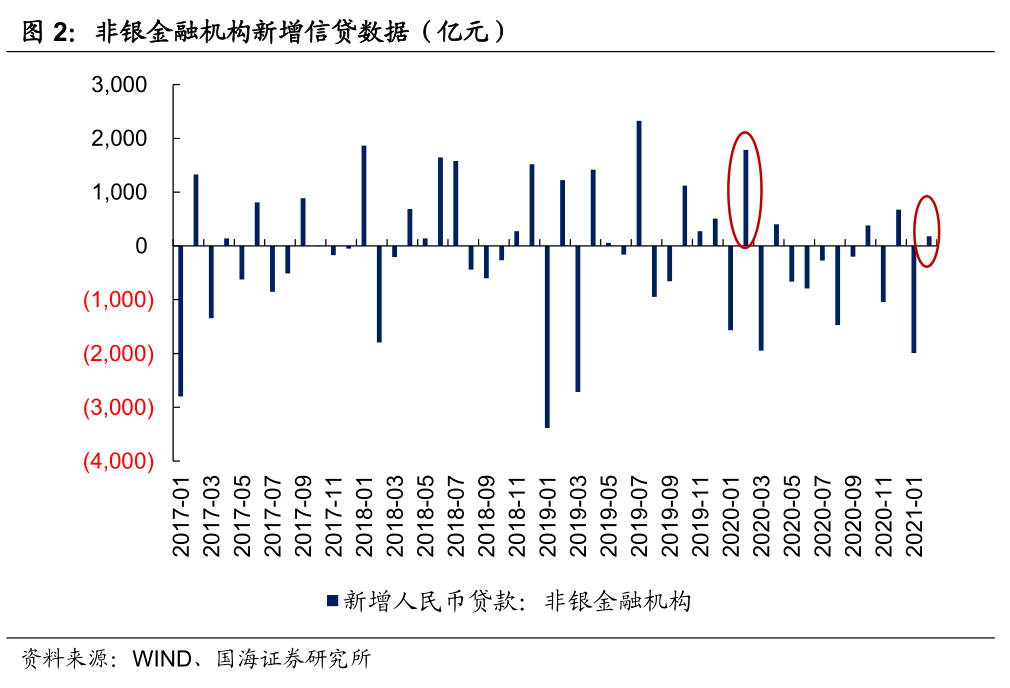 企业短期信贷方面,由于在去年疫情发生后,各大银行针对中小企业提供信贷支持,进而使得基数较高的情况下,今年2月份企业短期贷款增加2,497亿元,同比少增4,052亿元。而近期,受票据融资利率明显上行影响,企业票据融资减少1,855亿元,同比多减2,489亿元。