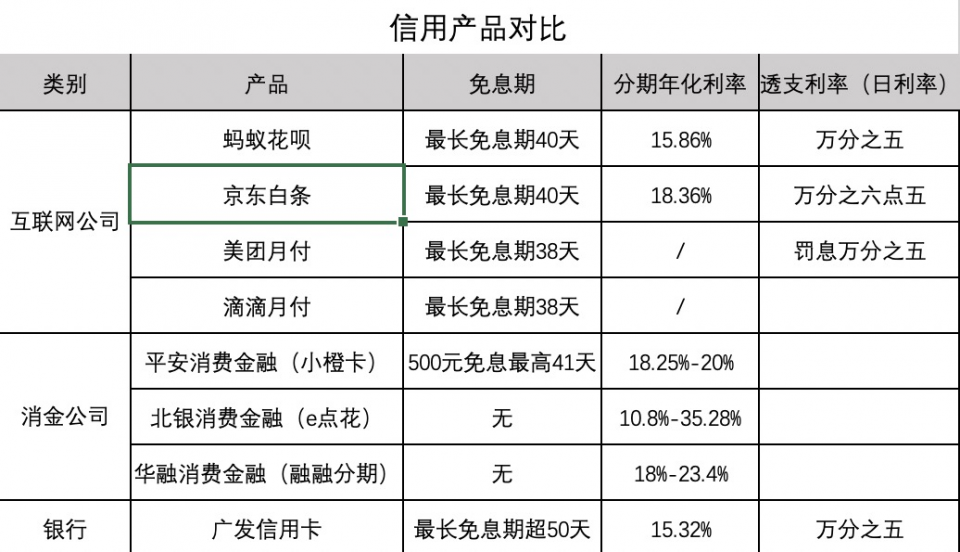 WEMONEY研究室将蚂蚁花呗、京东白条、美团月付、滴滴月付等做了对比。信用支付产品的账单周期一般是出账日在还款日之前,在还款日前消费会被计入当月还款时间,这就导致用户的最大免息期比较短,最短周期仅有十几天。