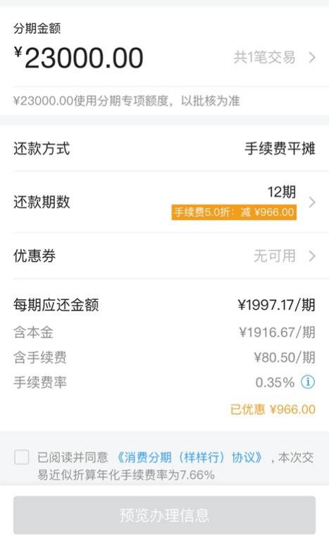 王女士表示,广发信用卡分期利率正在打折优惠。她分期23000元,利率五折后每期还1997.17元,12期共还23966.04元,每期手续费为0.35%,年化率显示7.66%,如果不打折的利率为15.32%。按照上述银行经理的说法,王女士的这笔消费金融,当月最低还款额为交易本金的10%,2300元。如果王女士要循环使用最低还款额,将会收取循环利息,当期的所有消费从交易日,开始计收利息,日息万分之五,直至全部还清。