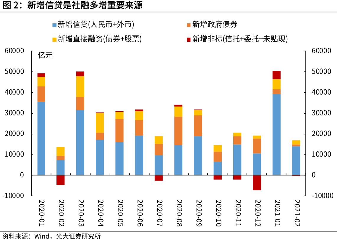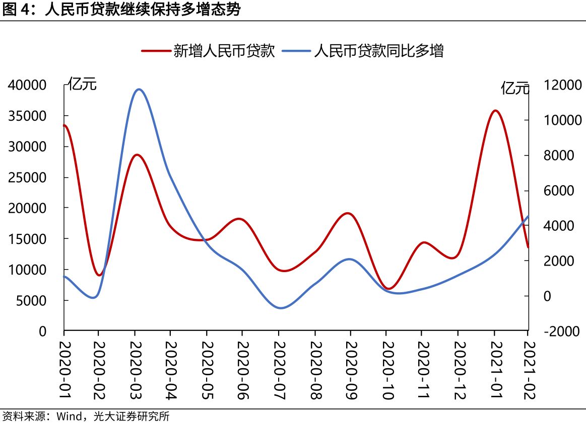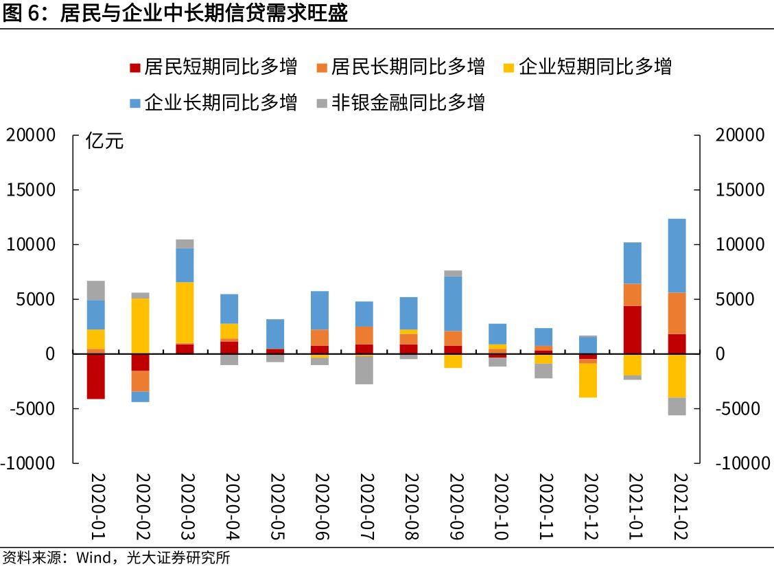 2月信贷数据“淡季不淡”,企业融资需求旺盛。社融和信贷大超预期,主要因为企业中长期信贷同比大幅新增。就地过年政策下,企业节后开工进度较快,融资需求展现旺盛态势。