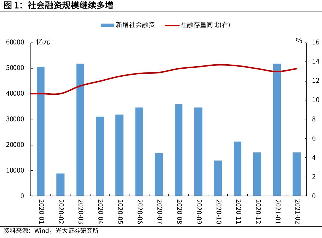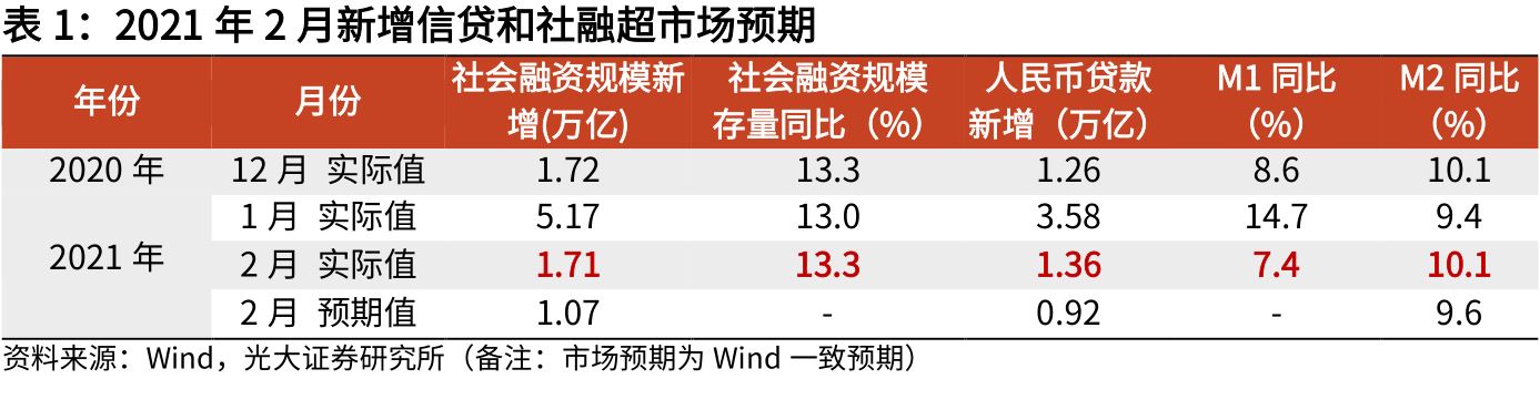 事件:2021年3月10日,中国人民银行公布2021年2月金融信贷数据,新增社融1.71万亿元,同比多增8392亿元,预期1.07万亿,前值5.17万亿;新增人民币贷款1.36万亿,同比多增4529亿元,预期9192亿,前值3.58万亿;M2增速10.1%,预期9.6%,前值9.4%。