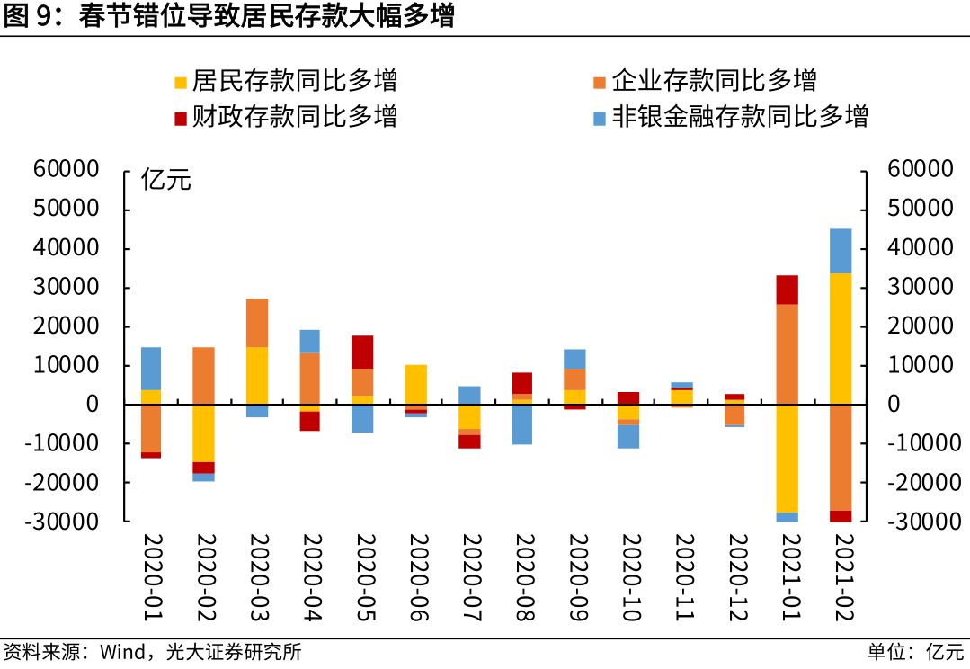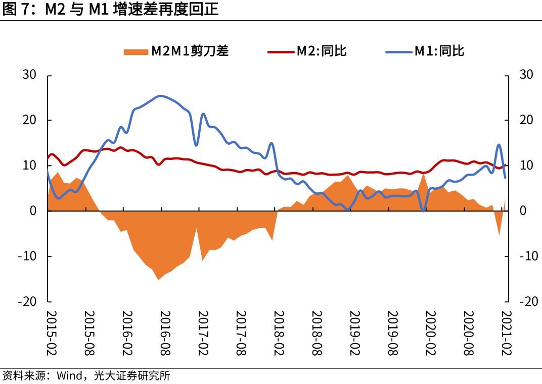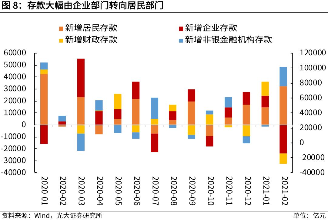 M2与M1增速差再度回正。2021年2月,广义货币(M2)同比增长10.1%,增速比上月高0.7个百分点,高于市场预期0.5个百分点;狭义货币(M1)同比增长7.4%,增速比上月低7.3个百分点。一方面,2月份进入春节,年终奖金与工资结算高峰,居民存款大幅增加,而企业活期存款则大幅减少;另一方面,2月份财政资金加速投放,财政支出较为积极。存款大幅由企业部门转向居民部门。2月份人民币存款增加1.15万亿元,同比多增1294亿元,其中,住户存款增加3.26万亿元,同比多增3.38万亿元;非金融企业存款减少2.42万亿元,同比多减2.70万亿元;存款大幅由企业部门向居民部门倾斜,主要源于今年春节移至2月份,企业奖金以及工资年终结算,导致企业存款减少,相应居民存款大幅增加。