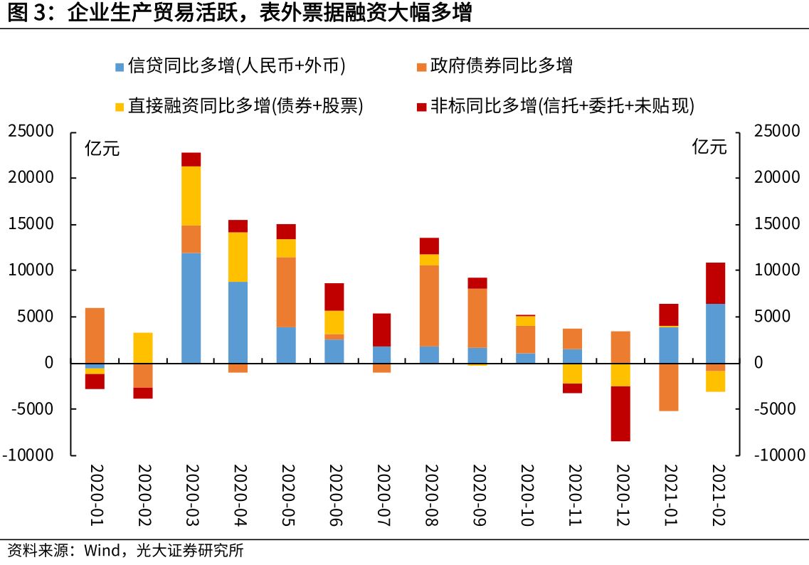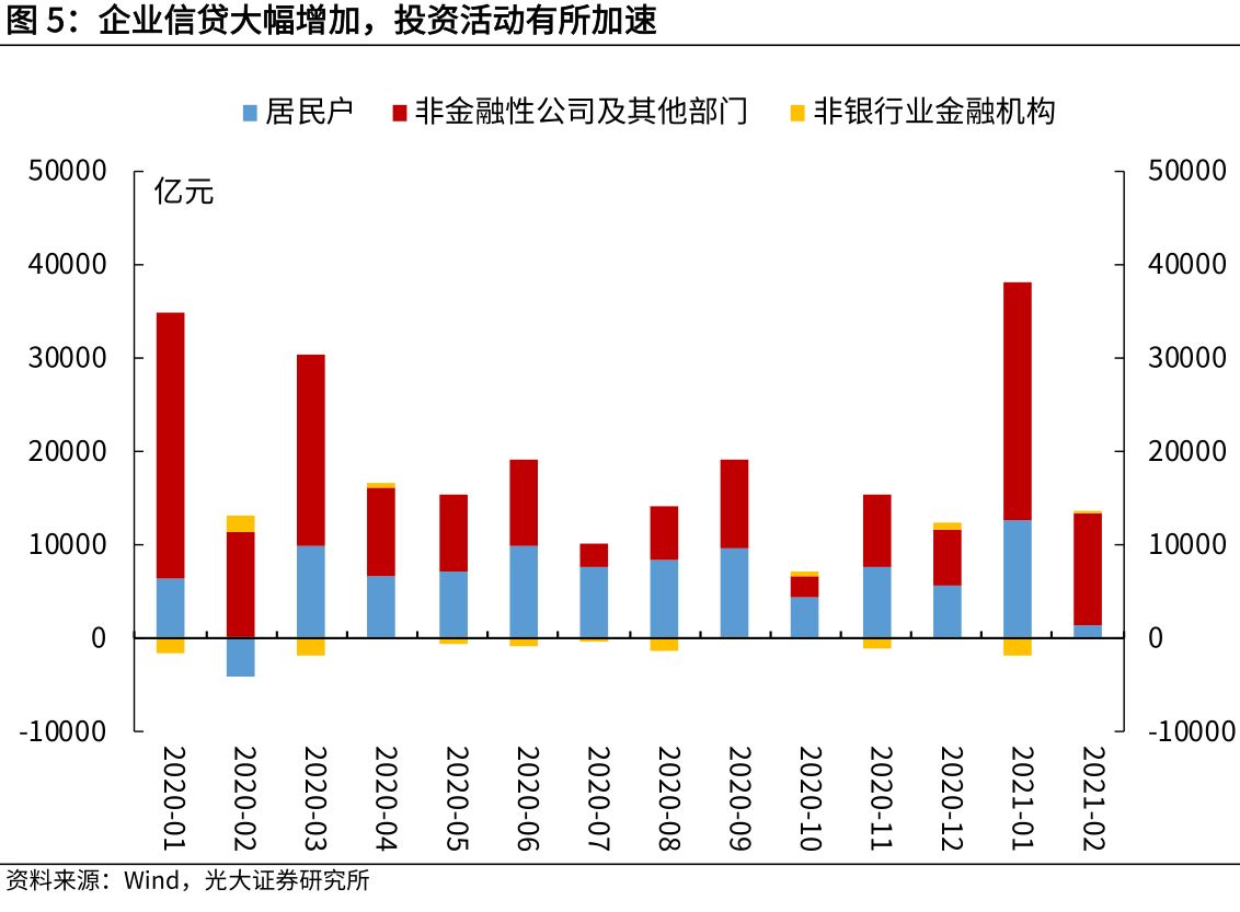 在企业端,2月新增中长期贷款1.1万亿,同比多增6843亿,同比增幅较2020年12月及2021年1月持续扩大,反映企业资本开支持续加速,制造业投资活动强劲。2月超预期的出口数据亦可印证制造业景气程度改善,企业有动力加大投资更新产能。企业短期贷款新增2497亿,同比少增4052亿;企业表内票据减少1855亿,同比多减2489亿。企业短贷和票据融资同比继续少增,主要受去年同期政策影响下短贷高基数效应,和当前信贷管控政策下,信贷额度结构性流向企业中长贷的影响。
