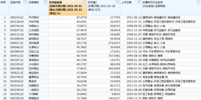 至3月12日收盘,沪深两市3月涨幅排名靠前的个股,仍然被小市值、冷门的“板凳球员”占据,其中2月底市值不过27.8亿元的开尔新材,成为涨幅榜冠军。