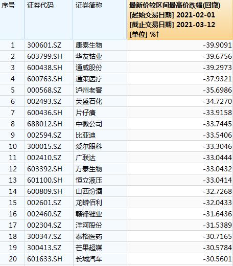 仅以沪深300成份股为例,2月初至今,92只个股距区间高点回撤超过20%,21只个股回撤超过30%,并主要集中在前期涨幅过高的白酒、新能源、医药板块。
