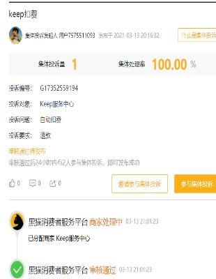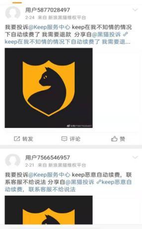 另据21世纪经济报道记者了解,此前还有多名消费者在黑猫投诉平台就Keep多次因自动恶意续费问题进行投诉。记者在微博平台以“Keep投诉”为关键字搜索,发现多名相关投诉事件,且退款遇阻。例如有用户于今年2月21日在黑猫投诉平台投诉Keep平台在消费者不知情的情况下恶意续费行为,且客服不给说法,无奈之下,消费者只能投诉维权。甚至有用户于今年3月13日针对Keep自动续费问题在黑猫投诉平台发起集体投诉。据黑猫平台显示,集体投诉是指同一个涉诉事件有多人存在消费纠纷,一人发起集体投诉后其他人可快速参与投诉让企业看到。同时,维权者可以信息共享,更好的维护自己合法权益。