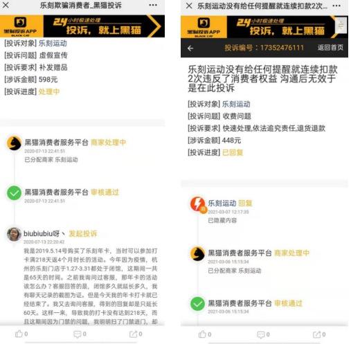除Keep平台外,记者还了解到乐刻运动也存在多起类似消费投诉纠纷,有用户名为“biubiubiu呀”的消费者于2020年7月13日在黑猫投诉平台投诉乐刻运动虚假宣传问题,涉及金额近600元。消费者称其与2019年5月14日购买了乐刻年卡,可以参加打卡满218天返4个月时长的活动。因为疫情,杭州的乐刻门店于2020年1月27日-3月31日都处于闭馆,这期间一共是65天的时间,客服表示活动以闭馆天数往后顺延,消费者表示有聊天记录截图为证。但是其发现年卡打卡提前结束,询问客服得到的回复却是只延长60天。记者发现,乐刻运动也涉及自动续费相关问题,有匿名用户在今年3月6日于黑猫投诉平台投诉称乐刻运动会员自动续费的情况,金额达近500元。
