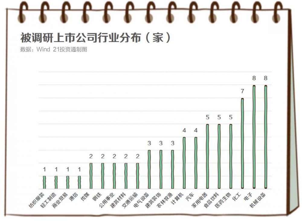 从行业分布来看,机械设备、电子行业最受机构青睐,均有8家相关公司被调研,包括:汉钟精机(002158.SZ)、埃斯顿(002747.SZ)、拓邦股份(002139.SZ)、顺络电子(002138.SZ) 等。其次为化工行业,共有7家公司获调研。上述行业均为今年以来机构重点关注的行业。